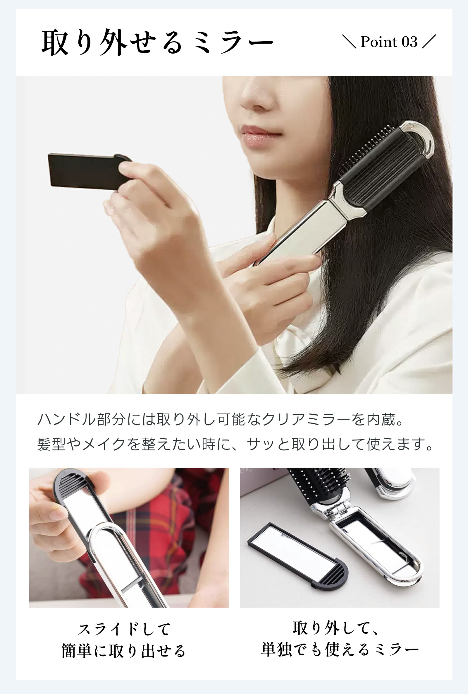 開くと片側にミラー、もう片側にブラシがセットされています。出かけるときの荷物を増やしたくない人にひったり!ハンドル部分にミラーを内蔵し、スライドして簡単に取り外します。お出かけでも鏡を見ながら髪をとかすことが可能です。