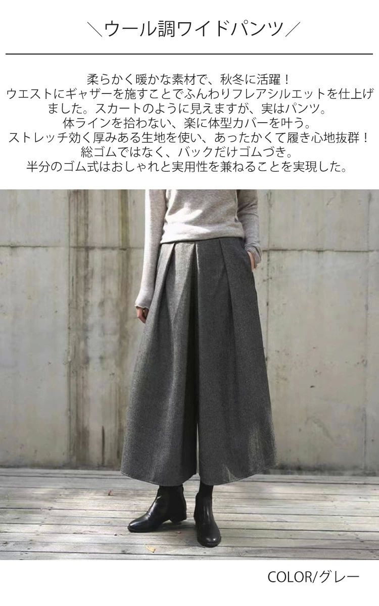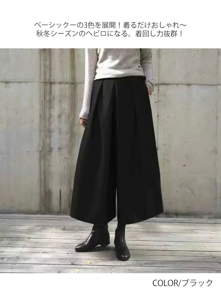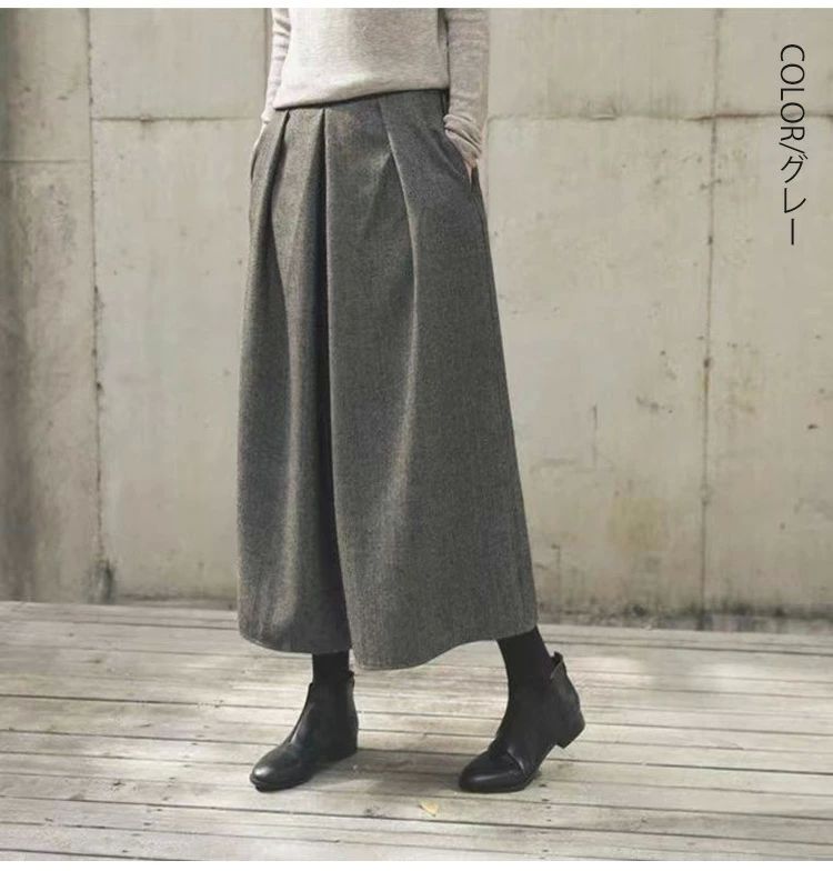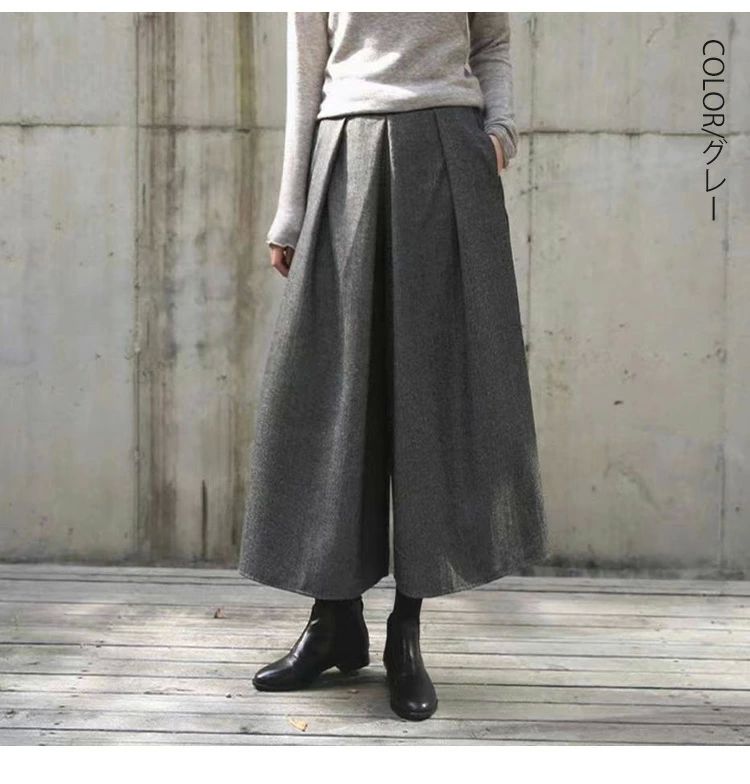 ワイドパンツ 秋冬 ウール調 ガウチョ レディースファッション 新作 ブラック グレー 人字柄グレー 人字柄ブラウン M L XL 高身長向き丈85cm!NEW