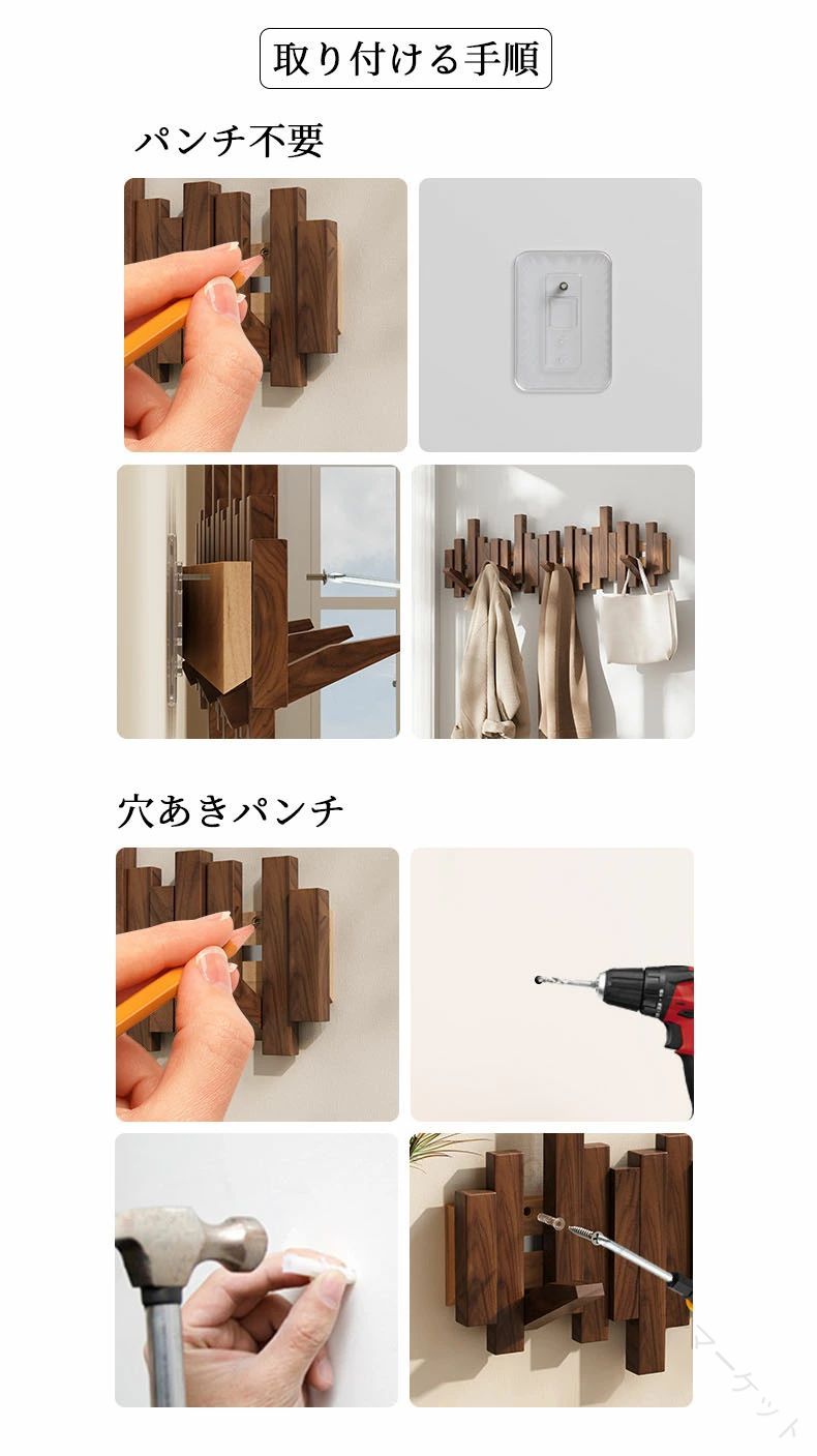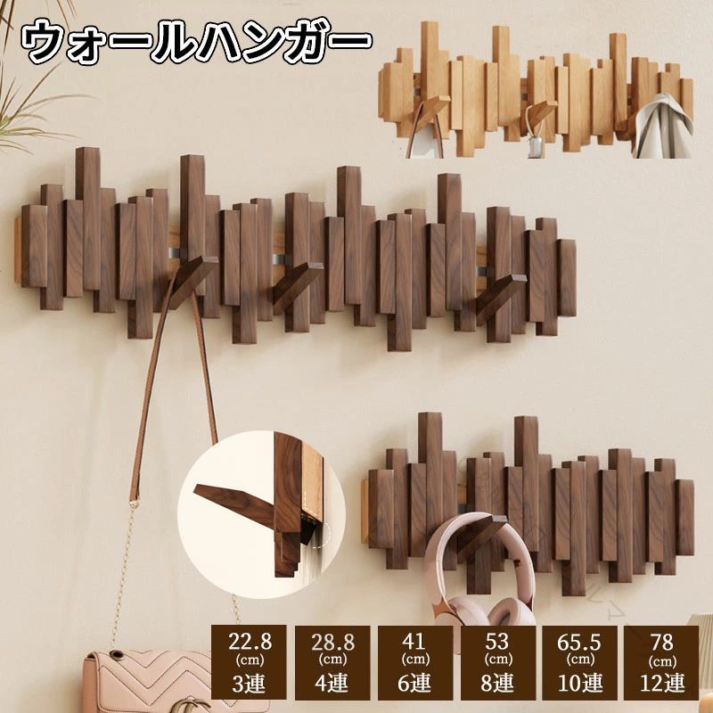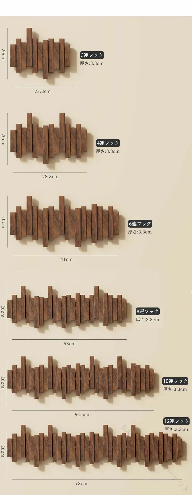 壁掛けフック ウォールハンガー フック 原木色 ブラウン 3連フック(22.8cm) 4連フック(28.8cm) 6連フック(41cm) 8連フック(53cm) 10連フック(65.5cm) 12連フック(78cm)
