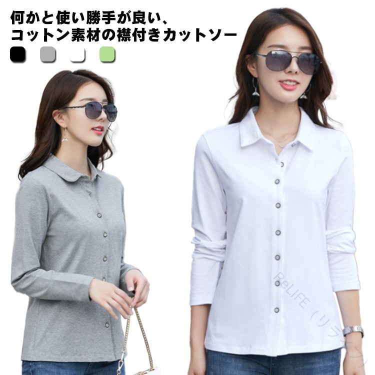 上質コットン レディースカットソー オフィスカジュアル 通勤シャツ 春秋対応 長袖トップス 洗濯耐久性 快適着心地 スリムシルエット 選べる襟型 角襟丸襟 無地トップス 上品なアイテム 前開きデザイン