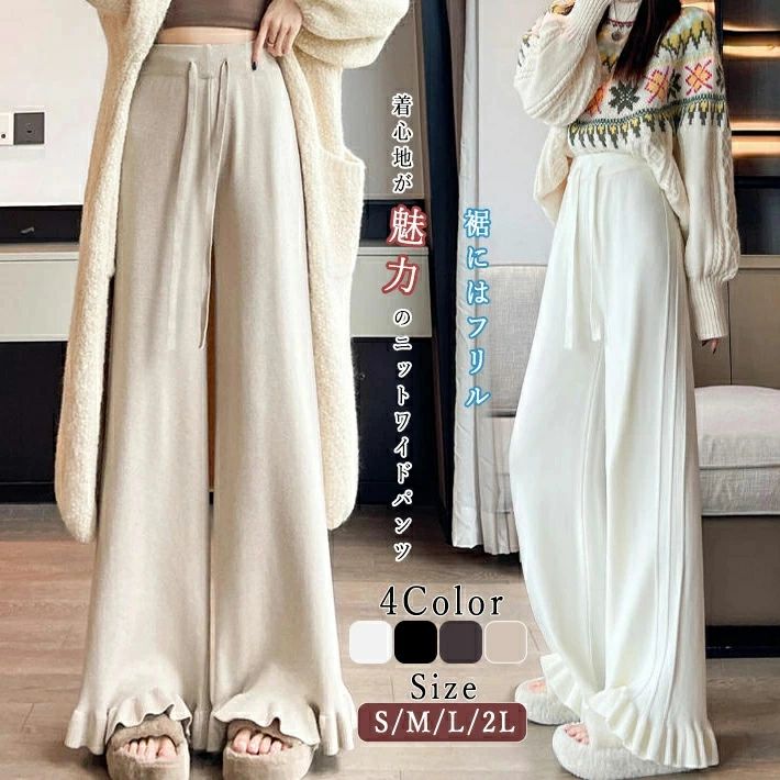 パンツ レディース ニットパンツ 裾フリル フレアパンツ ワイドパンツ ズボン ルームウェア 伸縮性 ボトムス ウエストゴ ロング