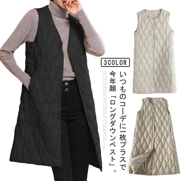 羽織り ノーカラー ダウンコート ロングダウンベスト インナーダウン ジャケット ロング丈 暖かい レディース 軽量 中綿ベスト