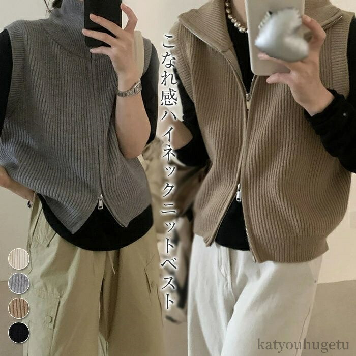 レイヤード風 柔らかい 軽い 重ね着トップスノースリーブ ジップアップ ハイネック 秋冬 レディース ベスト 前開き