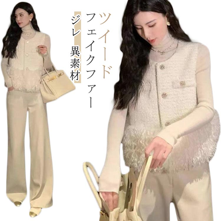 フェイクファー ツイード ジレ 異素材 ネック きれいめ オフィス デート