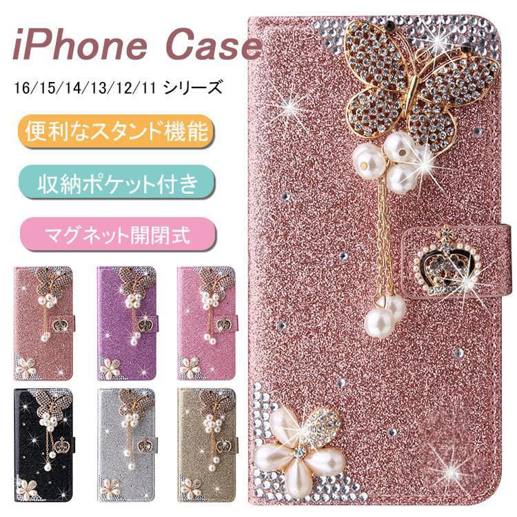 iphone16 15 14 13 iPhone12 11 Plus promaxパール ラインストーン キラキラ 手帳型 アイフォン 財布型 スタンド マグネット ケース カード収納