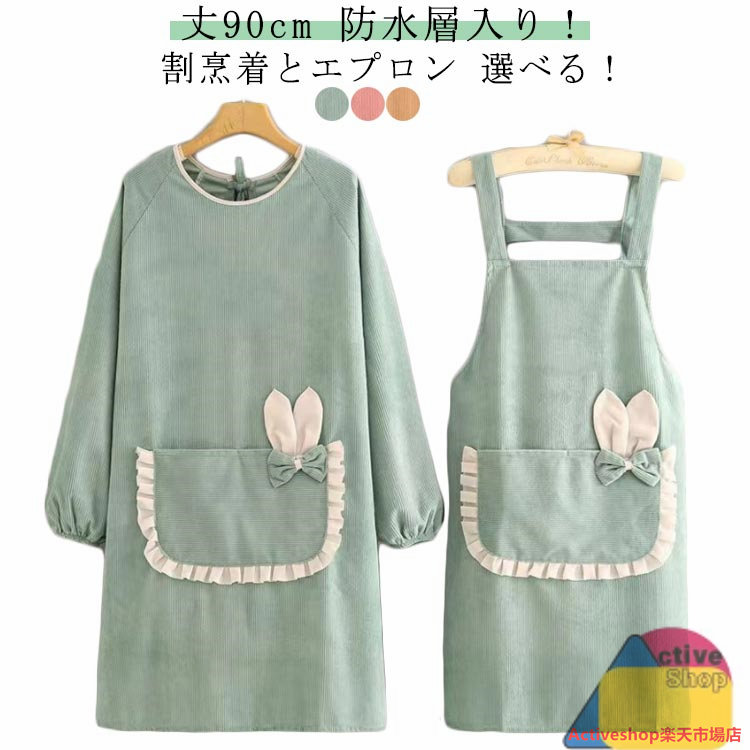 割烹着 ワンピース エプロン コーデュロイ 長袖 袖ゴム入り ゆったり くすみカラー グリーン ピンク イエロー 無地 北欧風 あったか暖かい おしり隠れる丈 秋冬用 結婚祝い プレゼント ギ 母の日