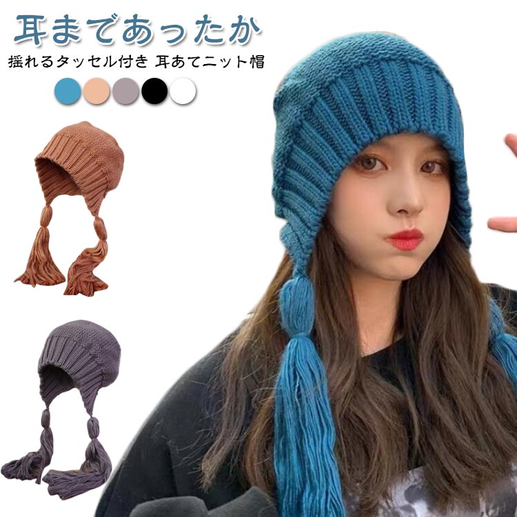 ニット帽 レディース 耳あて 揺れるタッセル フード 耳あて付き 帽子 バブーシュカ 秋冬 あったかフード帽 防寒 ニット バラクラバ お洒落 雪 可愛い プレゼント アウトドア
