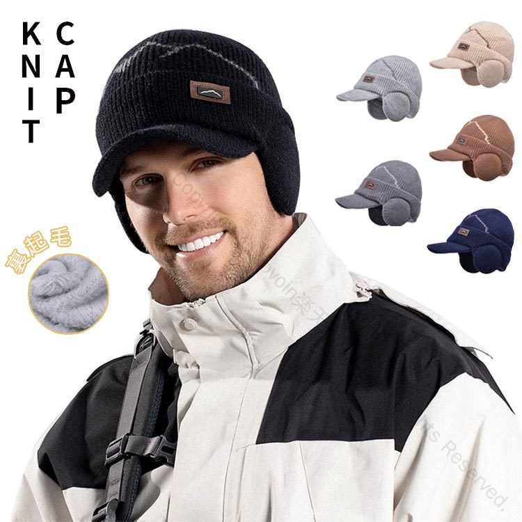 メンズ 冬 暖かい 耳あて つば ニット帽 アウトドア 防寒 ニットキャップ スキーニットキャップ つば付き 帽子 裏起毛 ニット イヤーマフ 秋冬 小顔効果 毛糸帽子 厚手 あったか 防寒キャップ