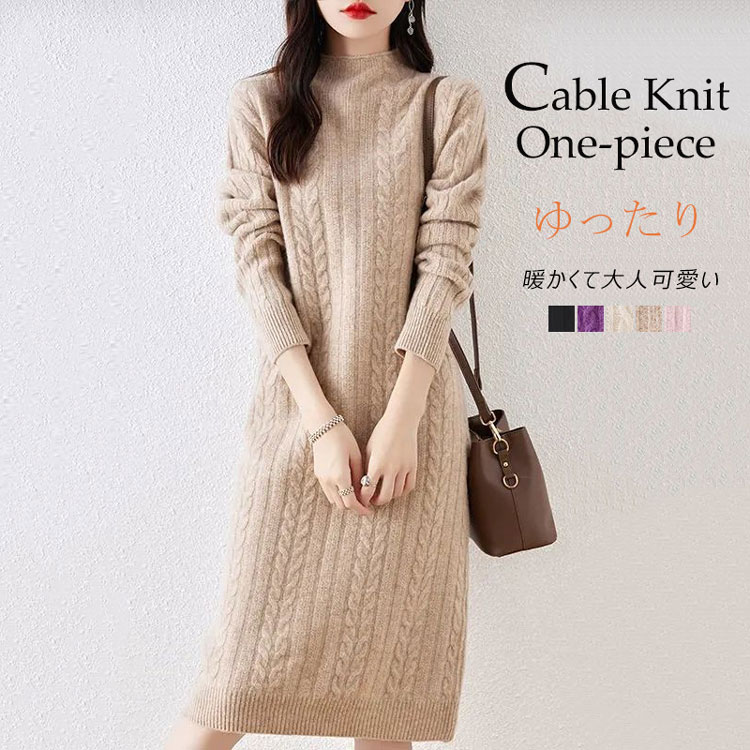 ケーブル ニット ワンピース レディース ニットワンピース 秋 冬 秋冬 ロングワンピース 長そで Iラ プチハイネック