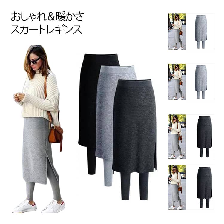 スカート付きレギンス レディース ボトムス スカートレギンス スパッツ 膝下 サイドスリット ひざ丈 膝丈 ウエストゴム スカート レギンス 体型カバー レギパン 冬コーデ 可愛い 一体型 細身 大人