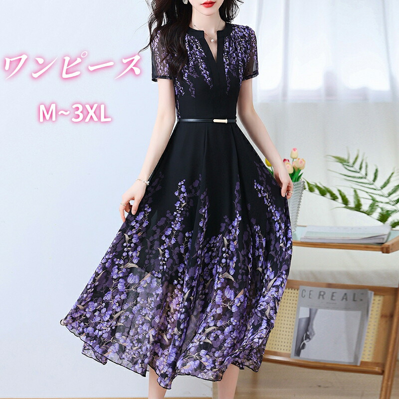 THOM WILLS ワンピース レディース 40代 ロングワンピース 春夏 半袖ワンピース 花柄ワンピ 配色 シフォンスカート Aライン ベルト付き カジュアル オシャレ 結婚式ドレス 大きいサイズ