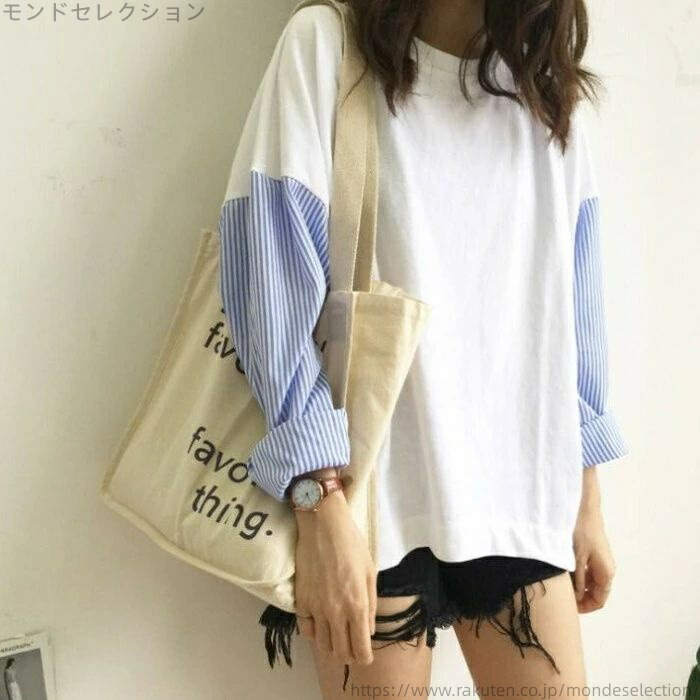 きれいめ カジュアル 長袖 サイドスリット 襟なし ストライプ 異素材 オーバーサイズ Tシャツ レディース 大きいサイズ