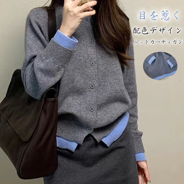 配色 ニット カーディガン レディース 春秋 冬 ニットカーディガン トップス 羽織 アウター カーデ 切り替え クルーネック ライトアウター 長袖 ニットカーデ レイヤード風 着回 ボタン