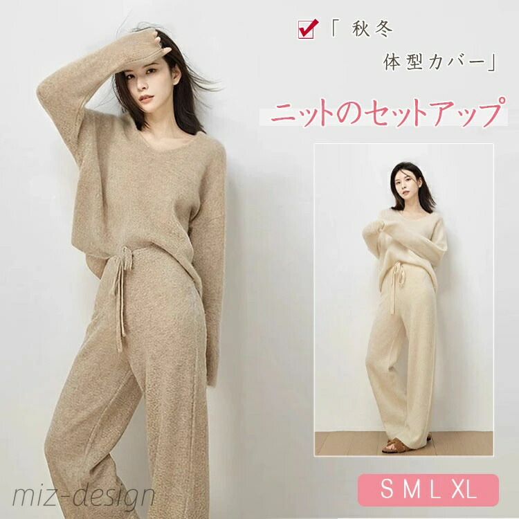 セットアップ レディース ニット 長袖 ズボン 上下セット 秋 冬 ドロップショルダー 体型カバー ハイウエスト ロング丈 ゆったり