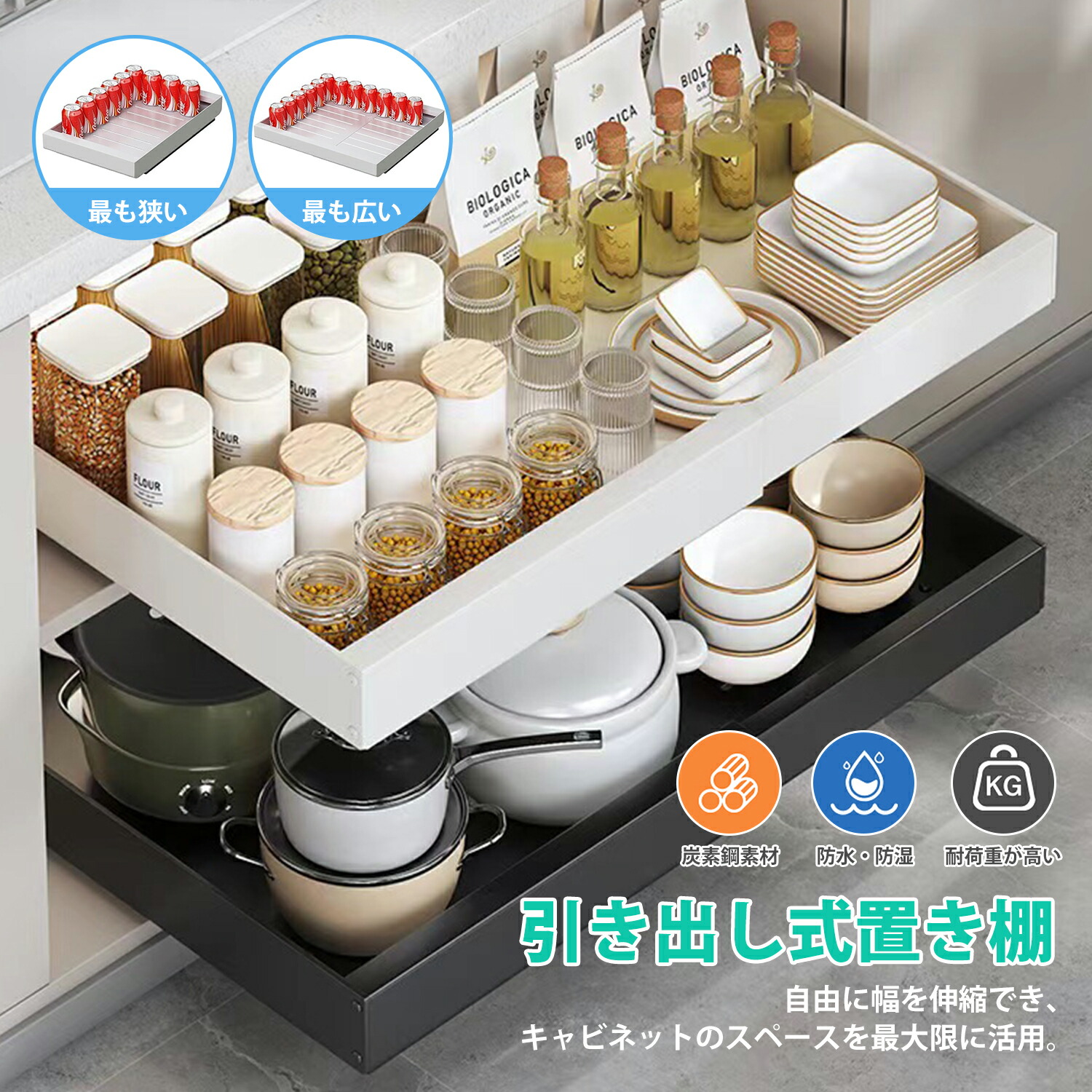 キッチン収納ケース 引き出し スライドレール付き 伸縮スライドボックス 引き出し式収納ラック ラック キッチン収納 スライドレール付き引き出し 幅53まで調整 奥隅でも取り出しやすい