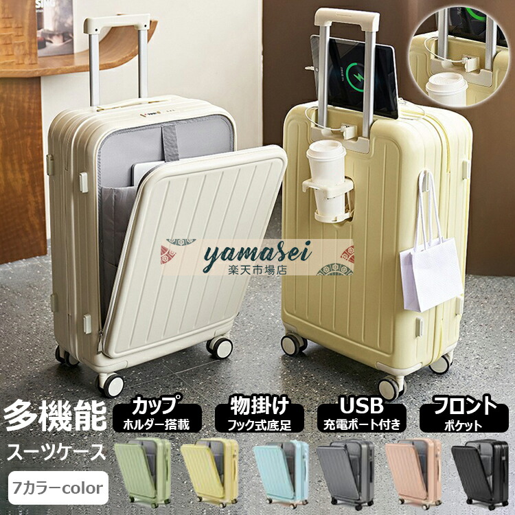 スーツケース フロントオープン 20 22 24 26インチ 軽量 USBポート付き 3泊4日 キャリーバッグ ドリンクホルダー 前開き ファスナータイプ キ 機内持ち込み