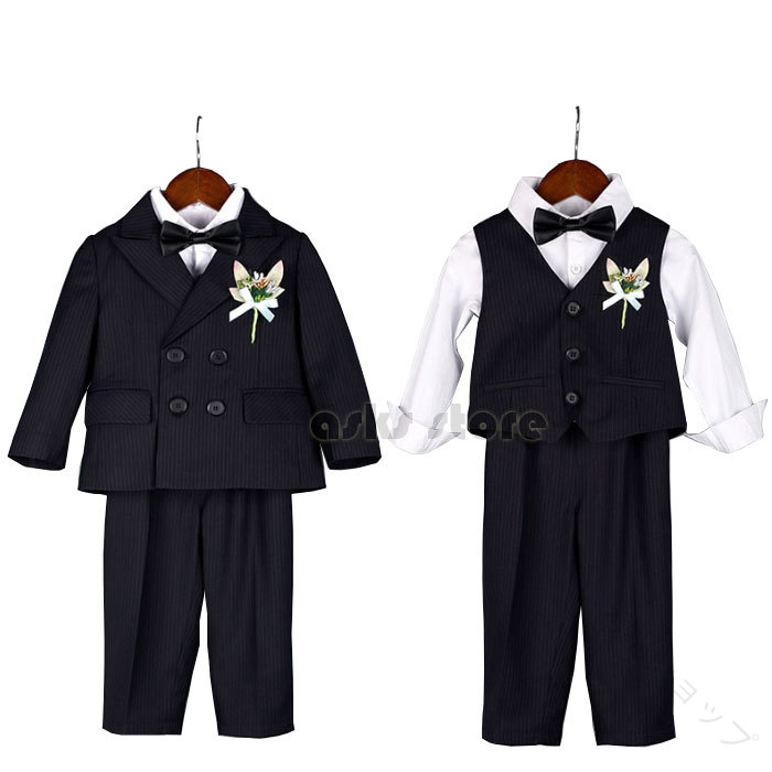 男の子フォーマルスーツ 韓国風子供服 キッズ礼服セット 子供スーツ4点セット 発表会用衣装 卒園式スーツ 入学式礼服 ピアノ演奏会衣装 キッズフォーマル 男の子蝶ネクタイ ストライプベス ステージ衣装