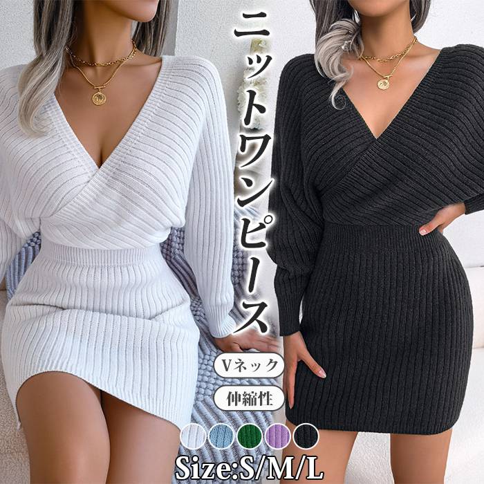 ニットワンピース リブニットワンピ 姫系 タイトワンピース 秋 ドルマンスリーブ Vネック 伸縮性 ストレッチ