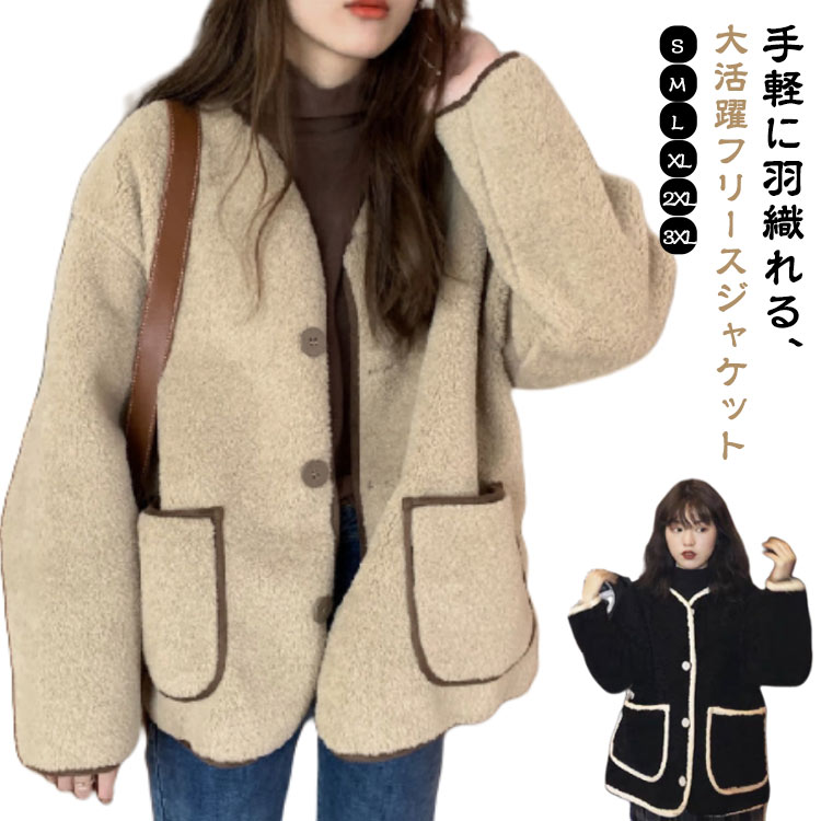 ノーカラー ジャケット フリース レディース 前開き ポケットあり アウター 上着 ボア カジュアル 春 秋 冬 おしゃれ