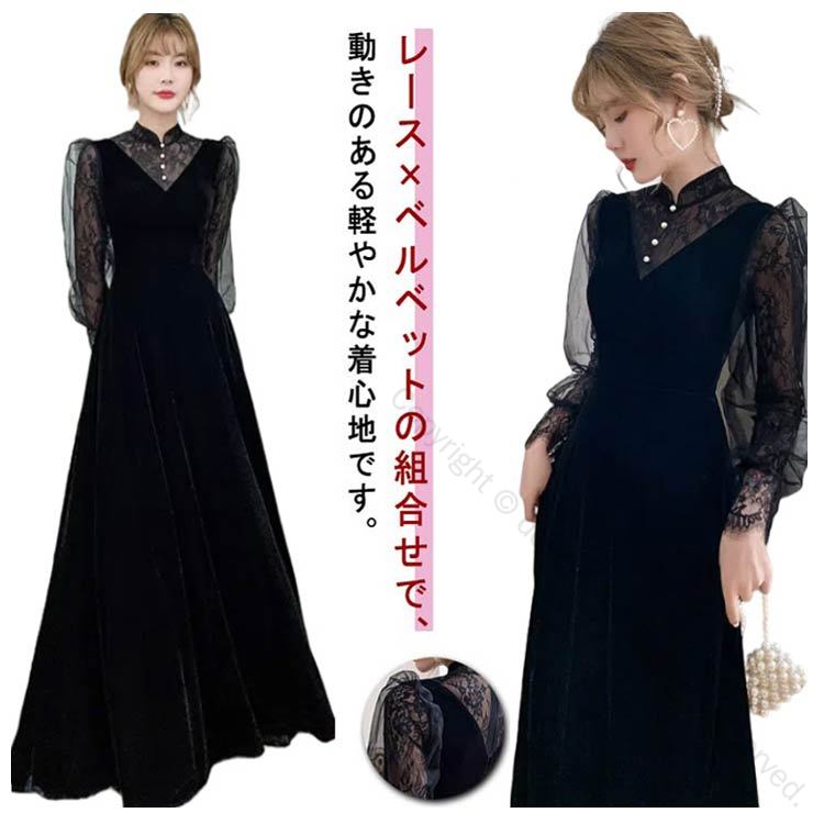 秋冬 ワンピース 透け感 パーティードレス 袖あり 韓国 レース ロング丈 お呼ばれ 結婚式 オケージョン 二次会 イブニングドレス 着痩せ レディース 体型カバー ぽっちゃり ロングドレス aライン