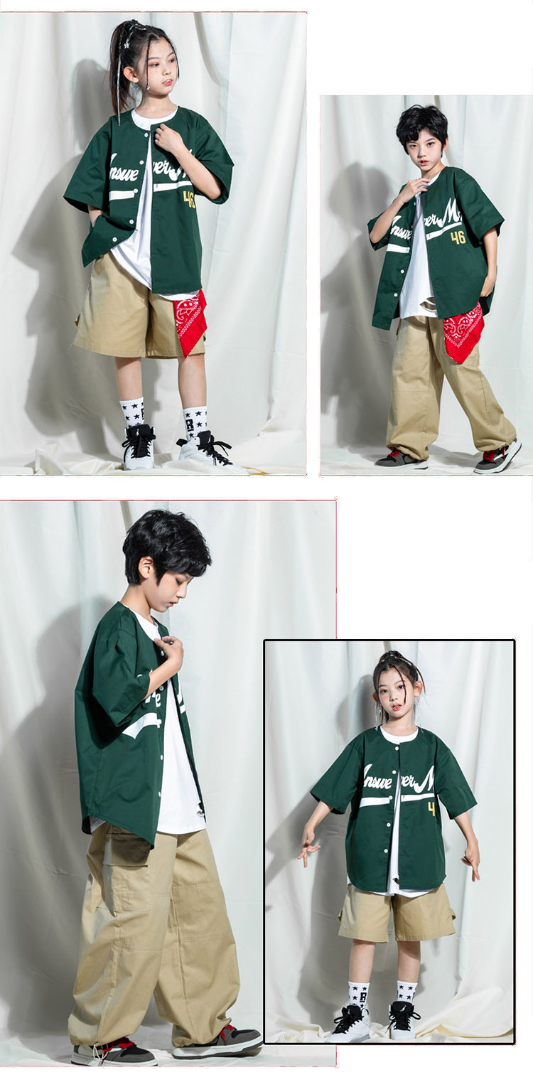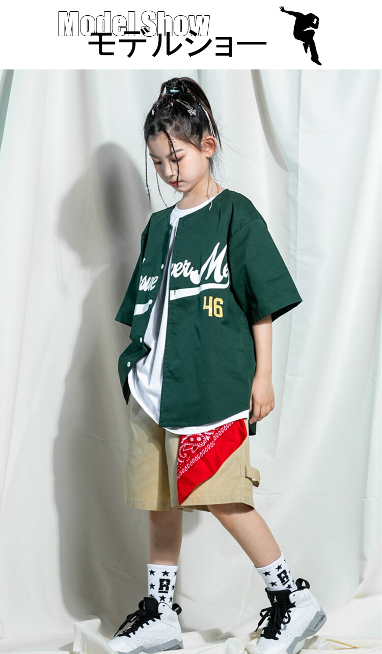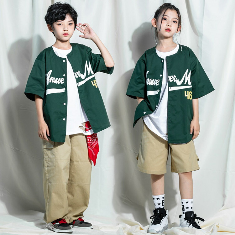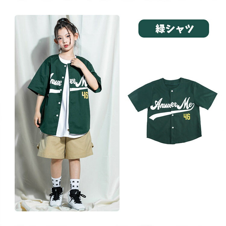 グリーン キッズ ダンス衣装 セットアップ 緑 ベースボールシャツ 半袖 野球 ダンスファッション 上下セット ダンスウェア 女の子 男の子 ジュニア HIPHOP ベージュ パ ヒップホップ