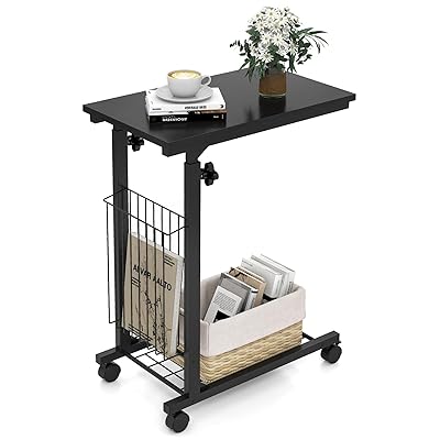 商品名:サイドテーブル キャスター付き 昇降式 高さ調節可能 幅30×奥行50×高さ65~105cm コの字型 移動便利 収納バスケット付き 金属フレーム 小テーブル ミニ コーヒーテーブル ベッド横 ソファー横 リビング 在宅勤務 スリム 小型 モダン おしゃれ(ブラック キャスター付き)