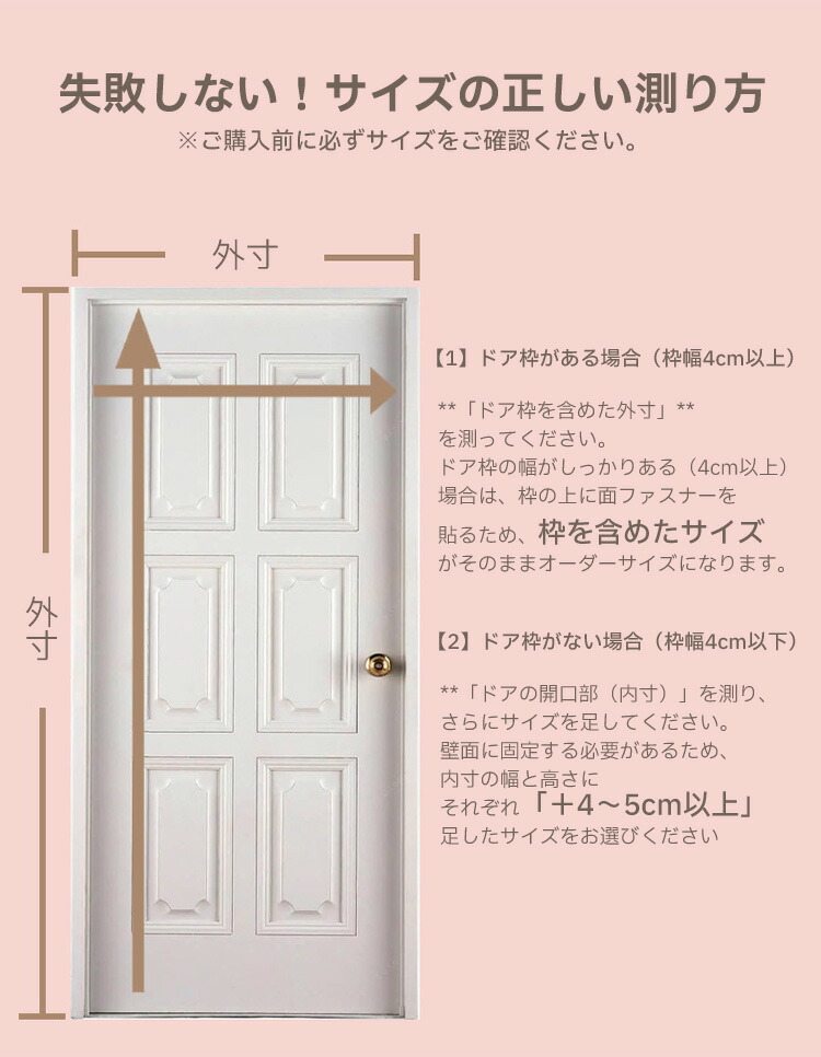 付属の強力面ファスナー(幅広マジックテープ)をドア枠に貼るだけで、誰でも簡単に設置可能。