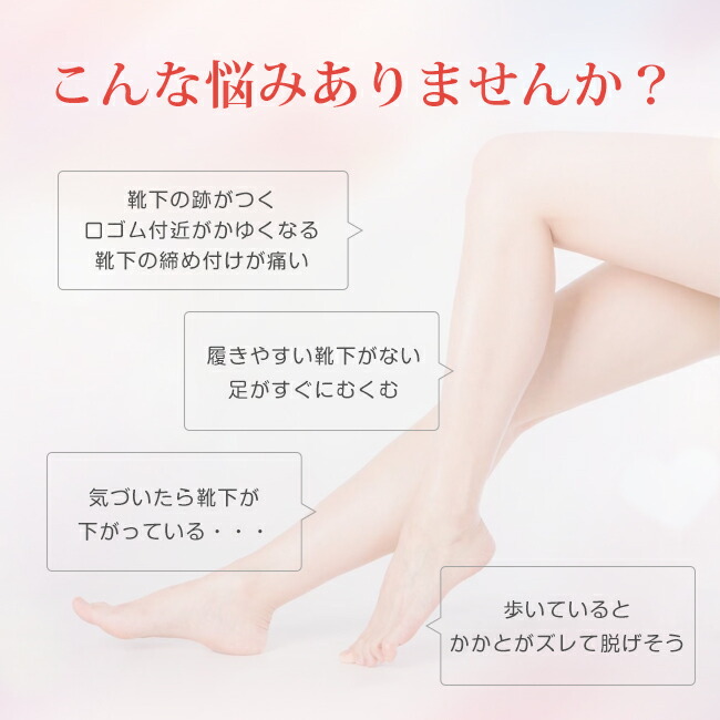 ・この靴下はかかとの上付近からふくらはぎ全体の広い範囲でゆったりと締める構造の為、しめつけ感が無いかのような、ゆったりした履き心地です。