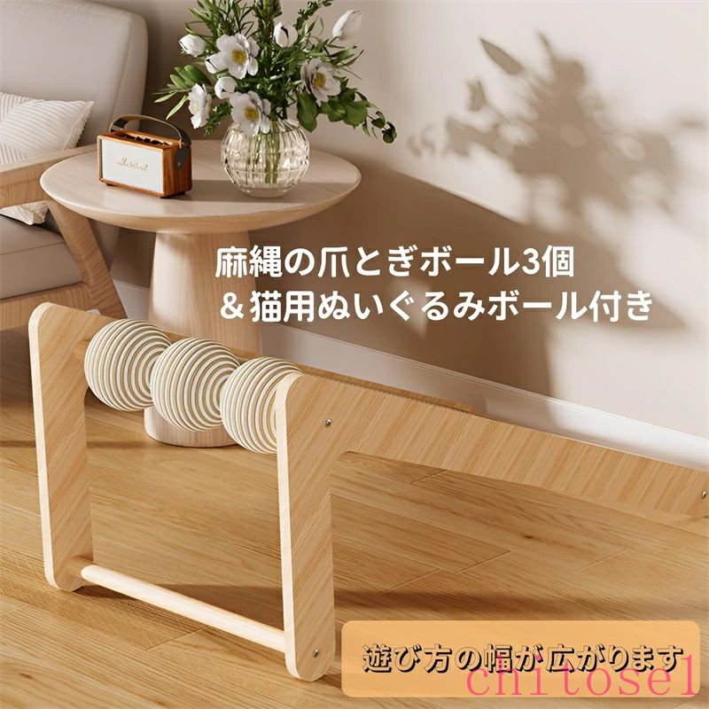【飽きさせない工夫】3つの麻紐ボールとポンポンのおもちゃ付きで、猫ちゃんの狩猟本能を刺激し、遊び心をくすぐります。猫 つめとぎとしてだけでなく、遊び道具としても最適です。
