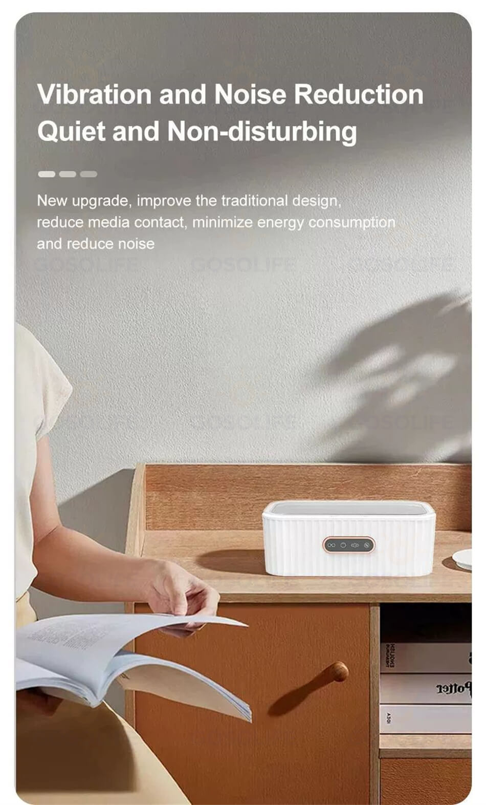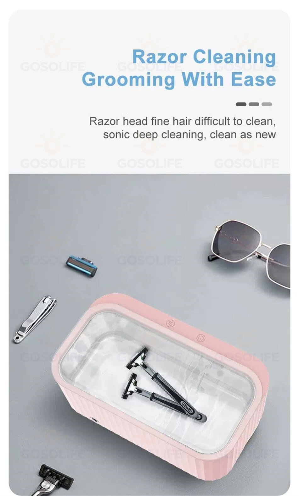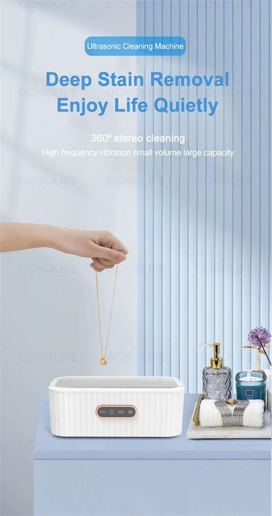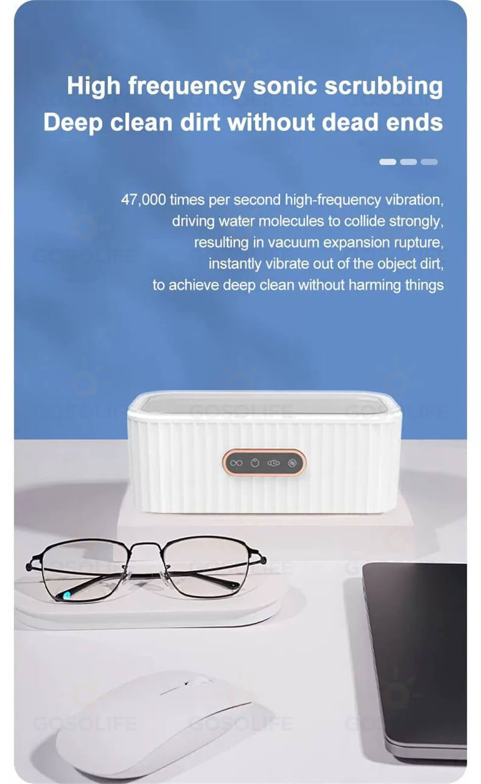 弊社の超音波洗浄機は約520gの重さと19cm*11cm*8.4cmのミニサイズで、旅行や出張でも持ち運びも便利です。