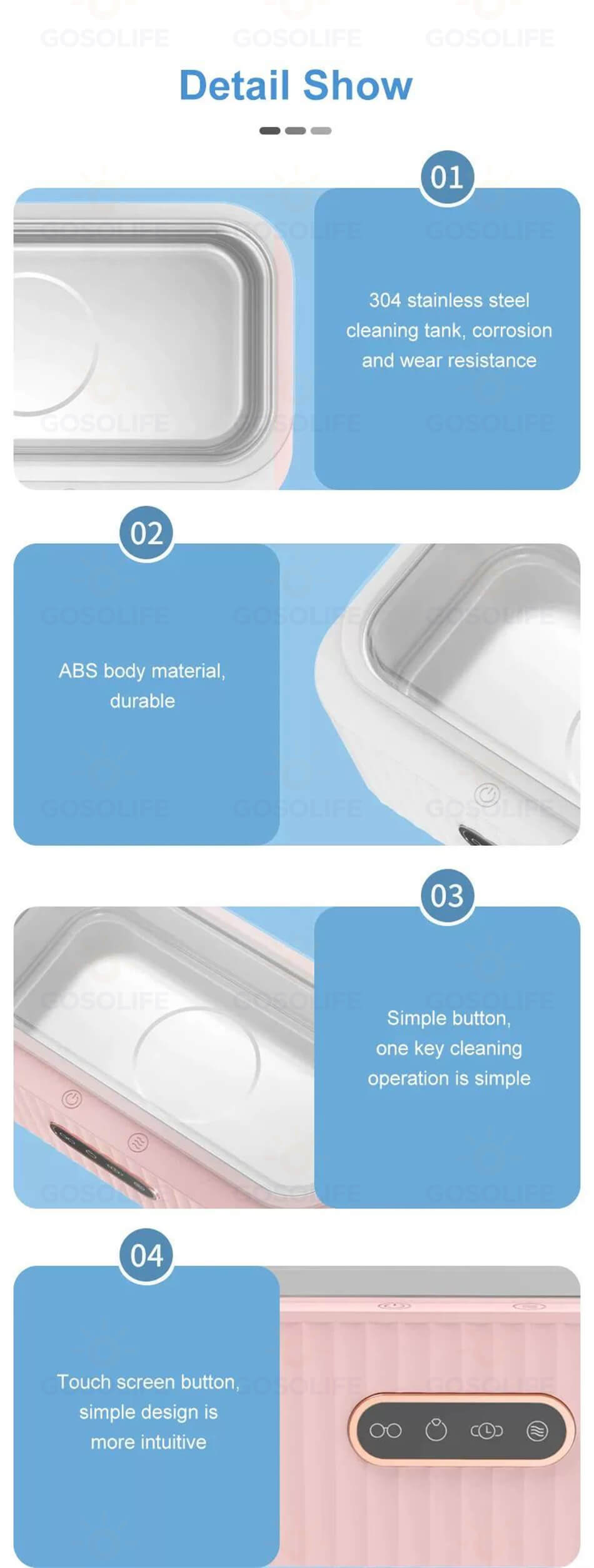 このメガネ洗浄機は春っぽい桜ピンク色をデザインして、部屋のインテリアに馴染みやすいです。耐食性に優れる304ステンレス材を採用し、油が付着しやすいプラスチック材より、掃除しやすい。日常清掃には、綺麗な布で拭けば良いです。