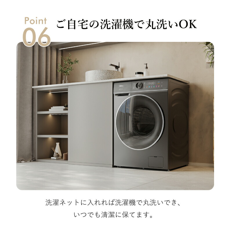 洗濯ネットに入れれば洗濯機で丸洗いでき、いつでも清潔に保てます。