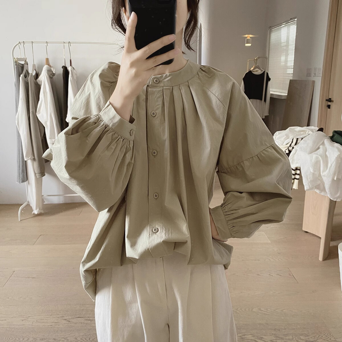 ランタンスリーブ ブラウス レディース ブラック グリーン M L