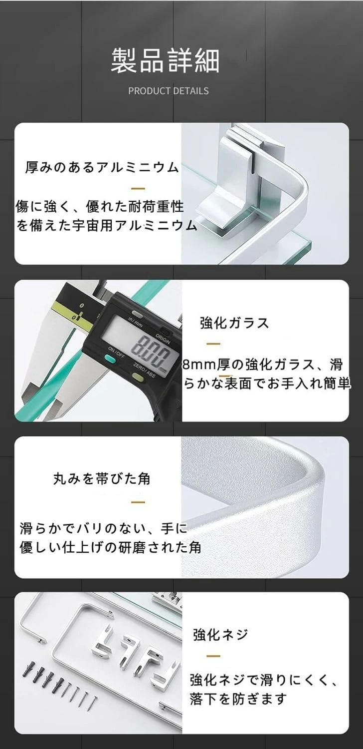 | 防錆:丈夫で耐久性があるアルミは陽極酸化処理された後、ほかの金属より優れた耐食性を備えています。 丈夫な構造:ネジは高品質な304ステンレス製です。金属のネジとブラケットは使用寿命を保証できます。 省スペース:化粧品や小物などを収納するのに最適です。化粧品を整理するためのコンパクトなサイズは、化粧台や取り外し可能な棚や引き出しに収納することができます。 省スペース:化粧品やバス用品、香味料を置くのは最適です。バスルームやキッチンなどの湿度の高い環境に適しています。スペースを節約できます。 部品含め:ネジ、ブラケットを含めていますので、ほかの部品を買う必要がありません。 | |
