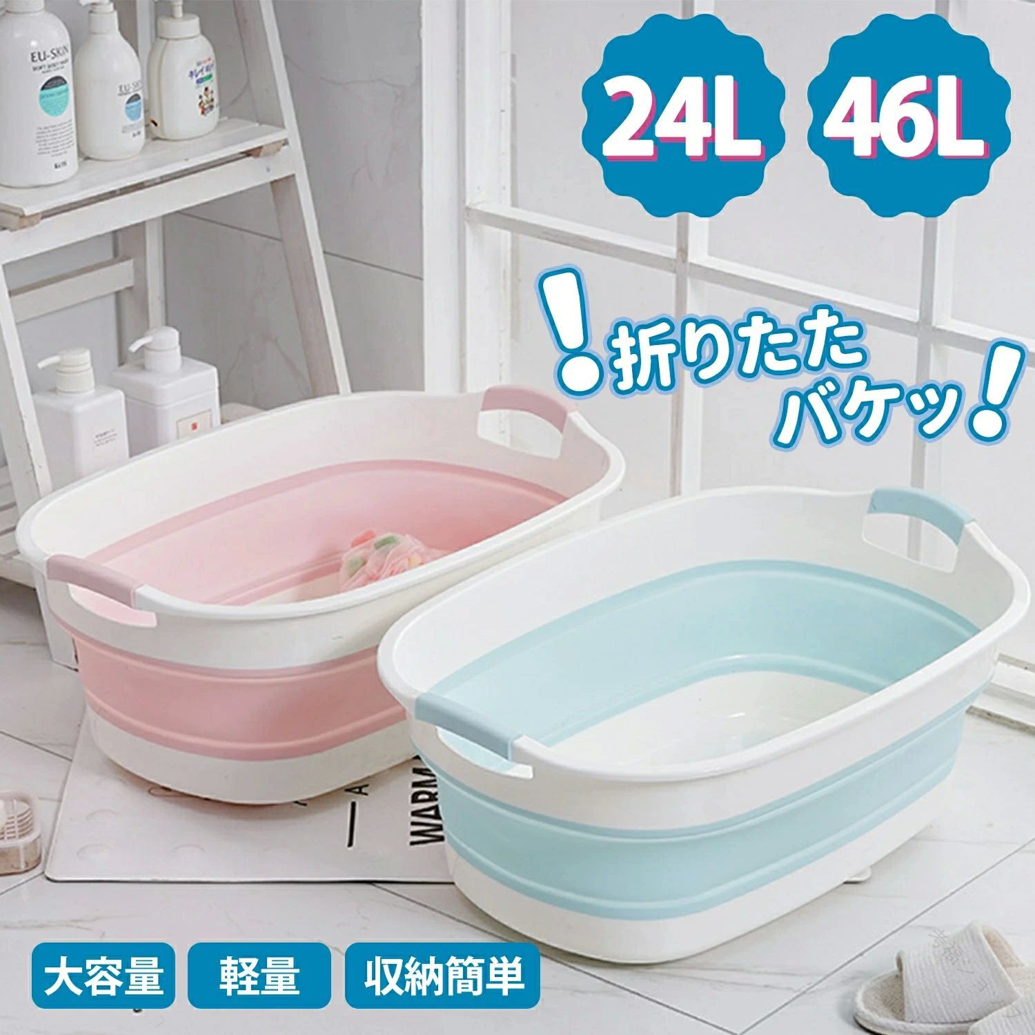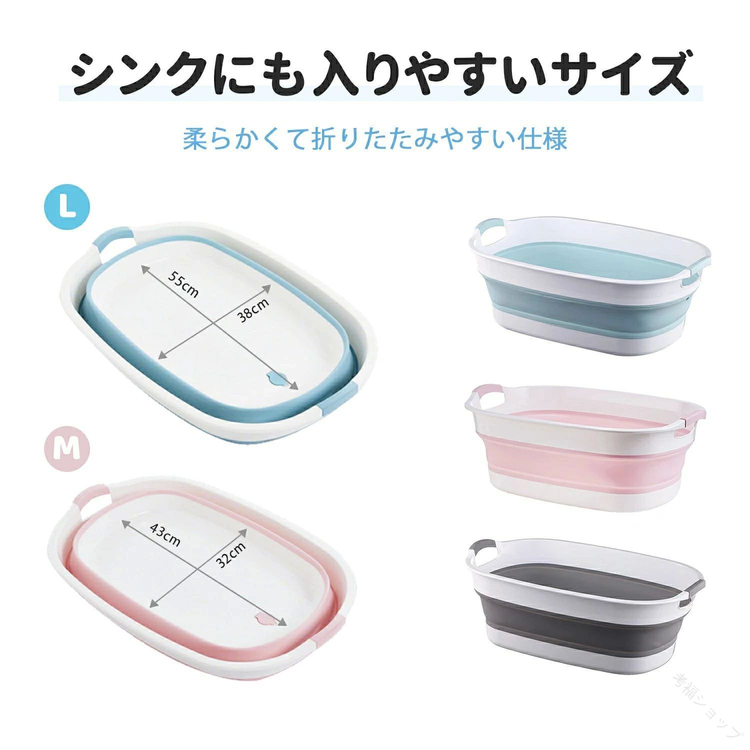 洗い桶 大型 折り畳みたらい 足湯 つ ピンク ブルー グレー M:43×32cm L:55×38cm