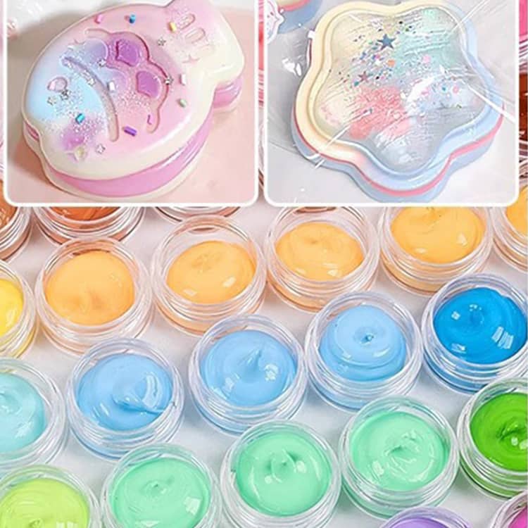 【セット内容】収納ケース、シリコンモールド×6、スクイーズジェルA・B 各200ml、スクイーズ用着色剤×6(※色はランダム)、パールリボン×20、飾りボール×2、EVA袋×10、ジッパー袋×2、カップ×2、30ml用計量カップ×10、ブラシ×1、かき混ぜ棒×10、ワセリン、スポイト×3、フロッキングパウダー、スパンコール