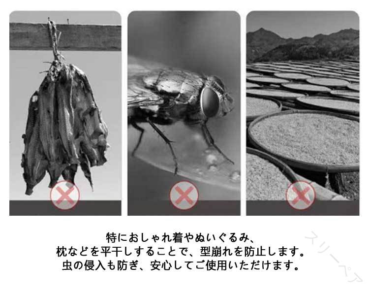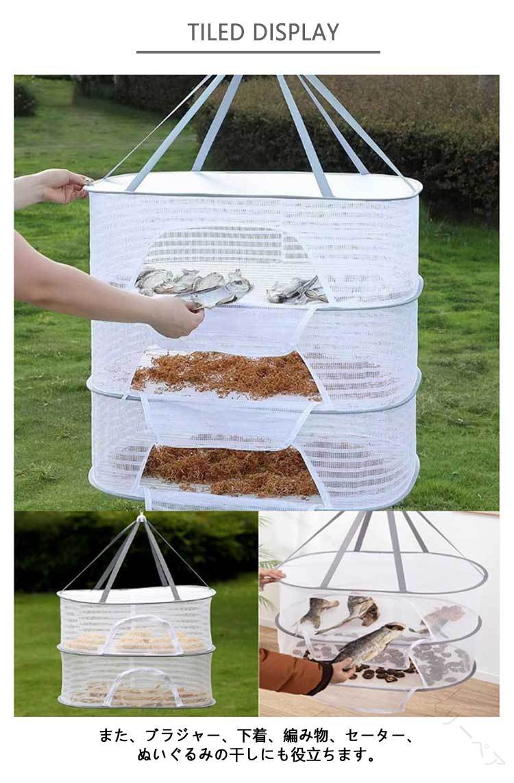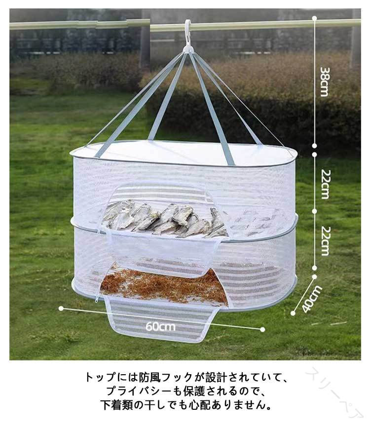 多機能!魚、野菜、梅、芋、 ハープの速乾に最適です。また、ブラジャー、下着、編み物、セーター、ぬいぐるみの干しにも役立ちます。特におしゃれ着やぬいぐるみ、枕などを平干しすることで、型崩れを防止します。虫の侵入も防ぎ、安心してご使用いただけます。風を防ぐカバー付き! 強風時にも安心して使用できる防風カバーが付いています。トップには防風フックが設計されていて、プライバシーも保護されるので、下着類の干しでも心配ありません。折りたたむとコンパクトになり、旅行や出張の際にも便利です。通気性のあるメッシュ構造で、洗濯物が速乾します。頑丈で耐久性抜群!6本の紐で耐久性がグレードアップ!各段の耐久性も非常に高く、ネット部分にはメッシュ素材のカバーが施されています。これにより、洗濯物が落ちてしまったり、虫の侵入を防ぐことができます。大容量&折り畳み式!折り畳み式で、使用しないときは簡単かつコンパクトに収納可能です。使うときにはゴムをはずすと、パッと開いて使える状態になります。小さく折り畳むことができるので、場所を取らずに便利です。ファスナーが付いているため、ぬいぐるみなどが落ちる心配がありません。安心して干せる設計です。使用シーン!ぬいぐるみ、ニット、下着、梅干し、干し野菜作り、魚干し、干し芋、ハープ、ドライフルーツなど、様々な場面で活躍します。生活のあらゆるシーンで便利に使える「多機能物干しネット」で、日々の家事をもっと快適にしましょう。