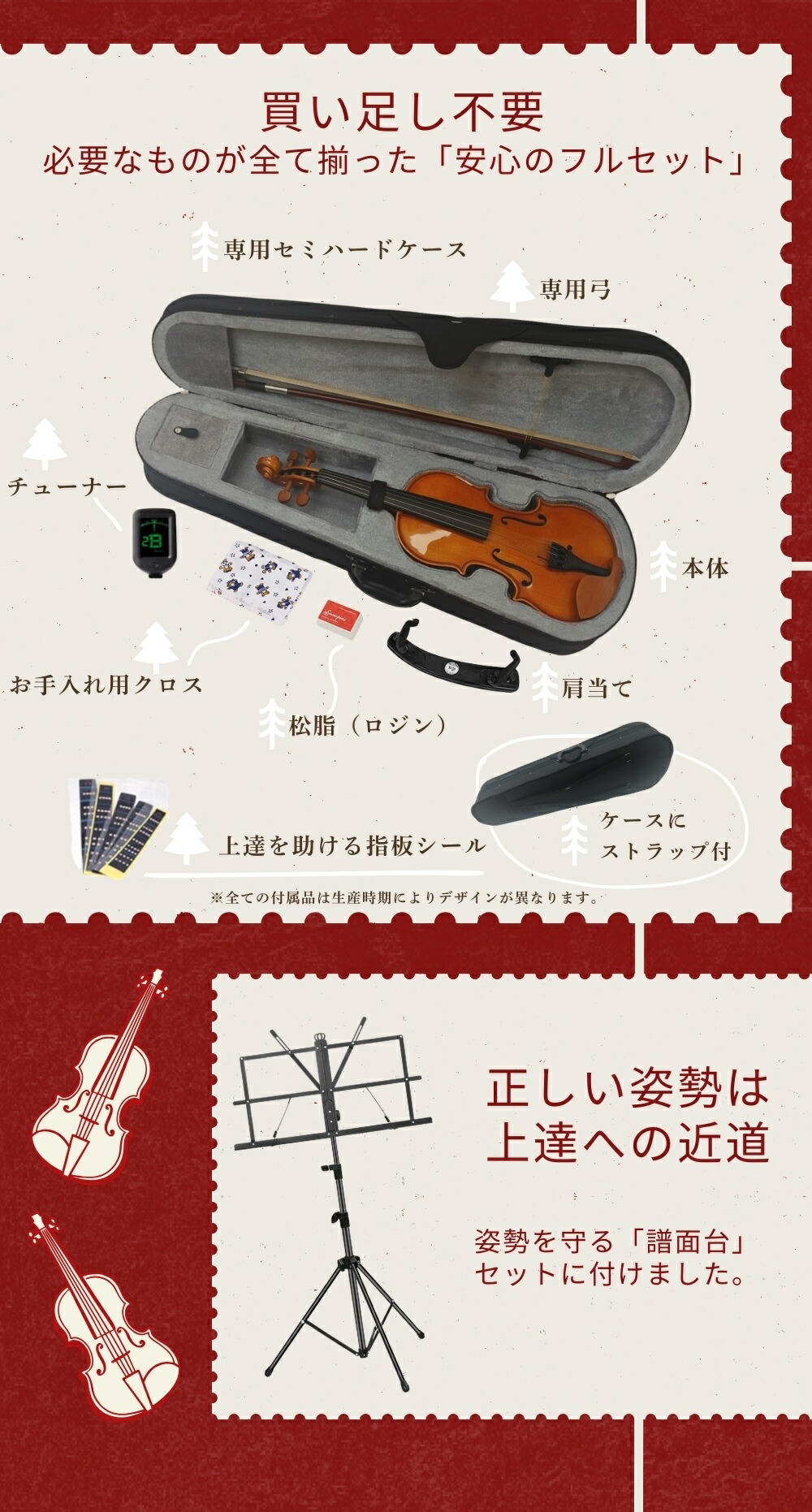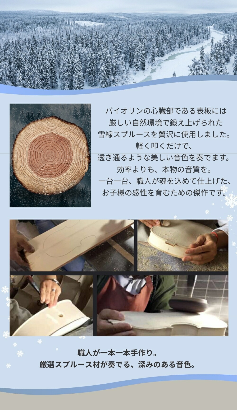 厳選されたスプルース材とメイプル材で作られたヴァイオリンは、低音の響きが深くなり、高音もより豊かで明るい音色を持っています。