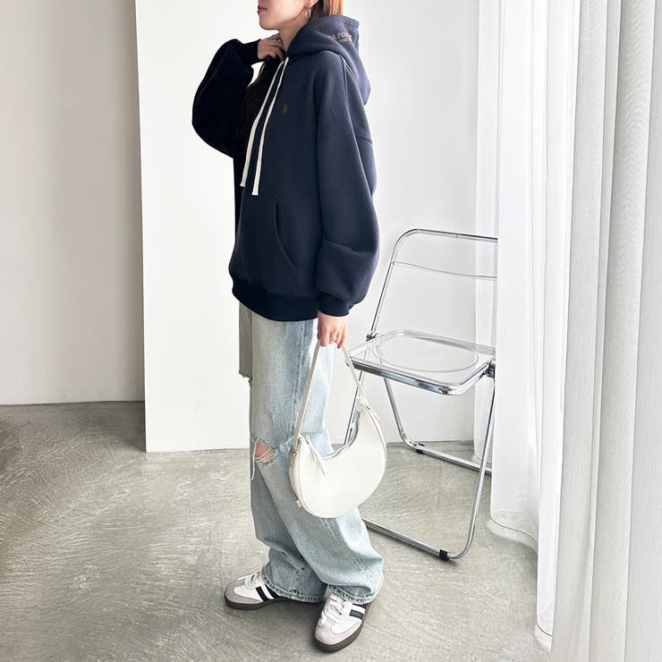 フードの刺繍が特別感たっぷりの裏起毛スウェットパーカー。
