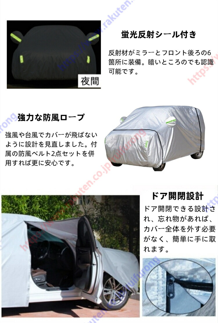 【強風対策】:強風や台風でカバーが飛ばないように設計を見直しました。カバーのフチにはゴムが施されており、車をしっかりとキャッチします。また、付属の防風ベルト2点セットを併用すれば更に安心です。