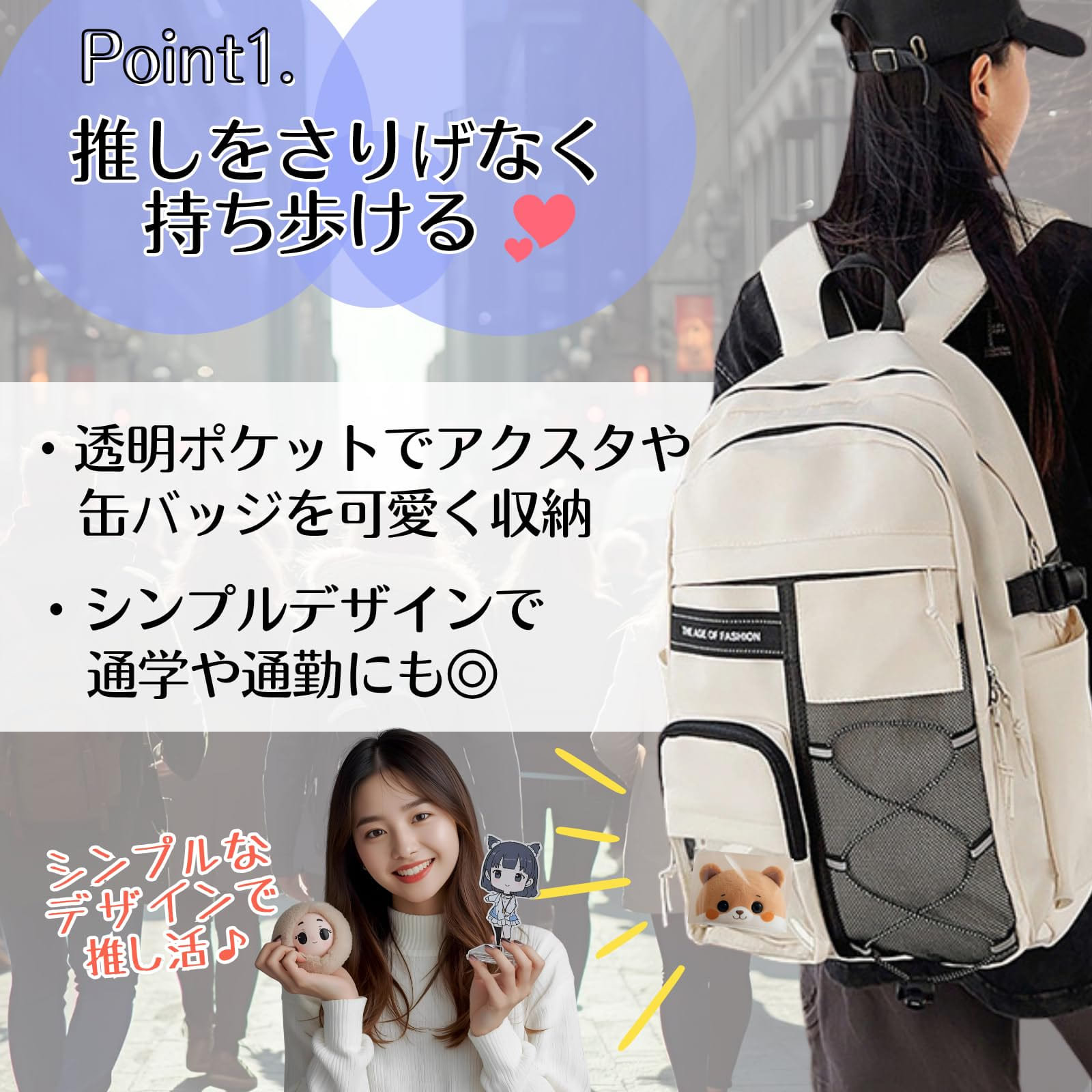 透明ポケットに好きなグッズを入れて、自分だけのオリジナルバッグにカスタマイズできます。イベントやライブの時は推しアイテムを飾って気分を上げ、普段のお出かけや通勤時にはシンプルに使えるWAY仕様。大きめの収納スペースにはノートPCや本、旅行用の荷物も入るので、日常からイベント、旅行まで幅広く対応します。