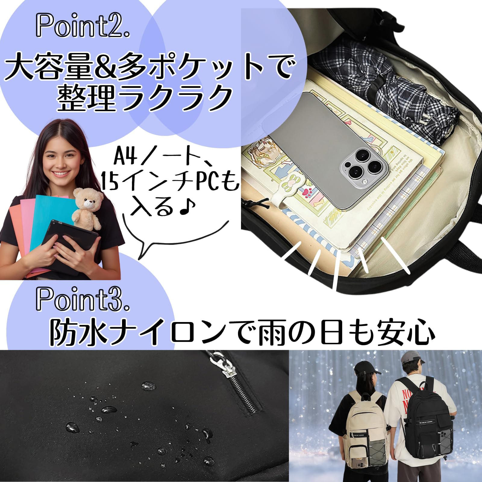 このリュックの一番の魅力はというところ。痛バッグといえば派手で日常使いしにくい印象があるかもしれませんが、このリュックは普段はシンプルなデザインのバッグとして、イベントの時は透明ポケットにグッズを入れて痛バッグに、とシーンによって使い分けができます。防水ナイロン素材を使用しているので、突然の雨でも中身が濡れにくく安心。さらに軽量なのに大容量設計で、ノートPCや水筒、折りたたみ傘、ポーチなどもラクラク入ります。内側と外側にポケットが多く、整理整頓もしやすい仕様。性別や年齢を問わず使えるシンプルなデザインなので、学生さんはもちろん社会人の方や休日のおでかけバッグとしてもピッタリ。推し活と日常生活を両立できるリュックは、ありそうでなかった便利アイテムです。