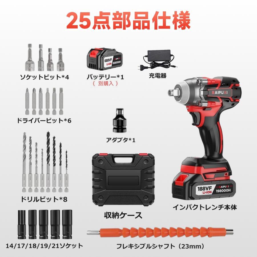 超強力トルク インパクトレンチ タイヤ 本体のみ(バッテリーなし) 本体+バッテリー*1+充電器*1 本体+バッテリー*2+充電器*1 本体+11点のパーツ 本体+25点のパーツ