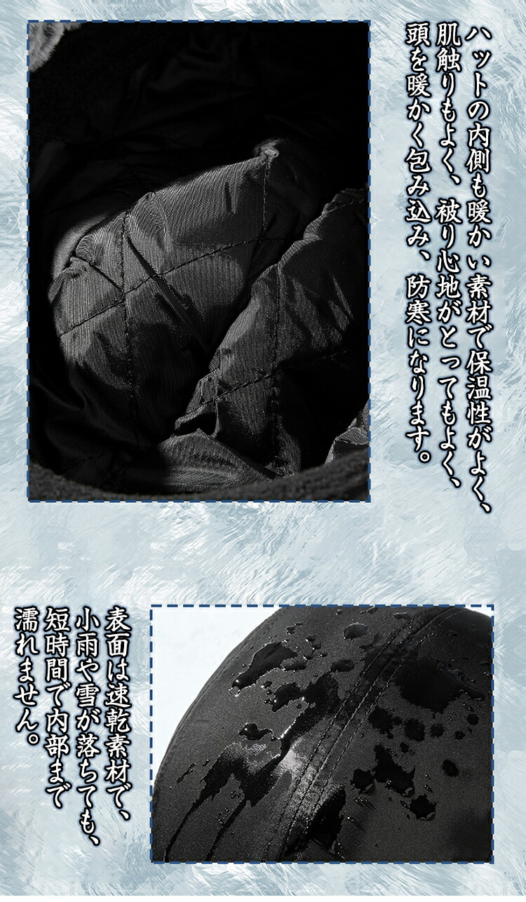 【暖かい素材】ハットの内側も暖かい素材で保温性がよく、肌触りがよく、被り心地がとてもよく、頭を暖かく包み込み、防寒になります。表面は速乾素材で、小雨や雪が落ちても、短時間で内部まで濡れません。