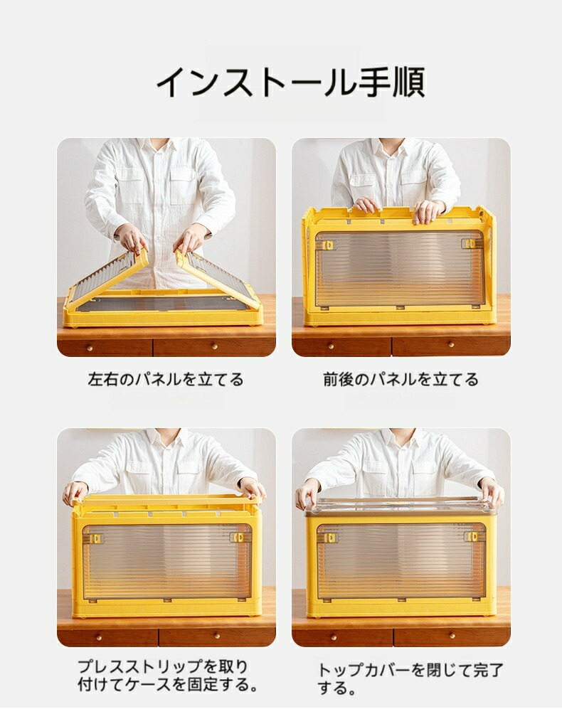 実用性も強いです。このコンテナボックスを折りたたんで収納できます。キャビネットや衣装だんすの中に入れたり、折りたたんでキャビネットや衣装だんす、靴箱として利用できます。本体は高品質なPPを採用し、高い靭性、耐磨耗・引き裂きに強く、より強い荷重能力があります。使用するときは何個のボックスを積み重ねて形を変えられません。
