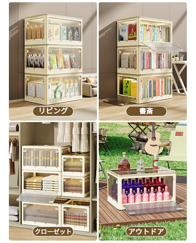 ・物の出し入れは上だけではなく、左右前後も扉付き、ボックスを積み重ねる状態にも楽に横から物を取り出して、伝統的な収納ボックスに比べてもっと便利で、機能性が向上します。