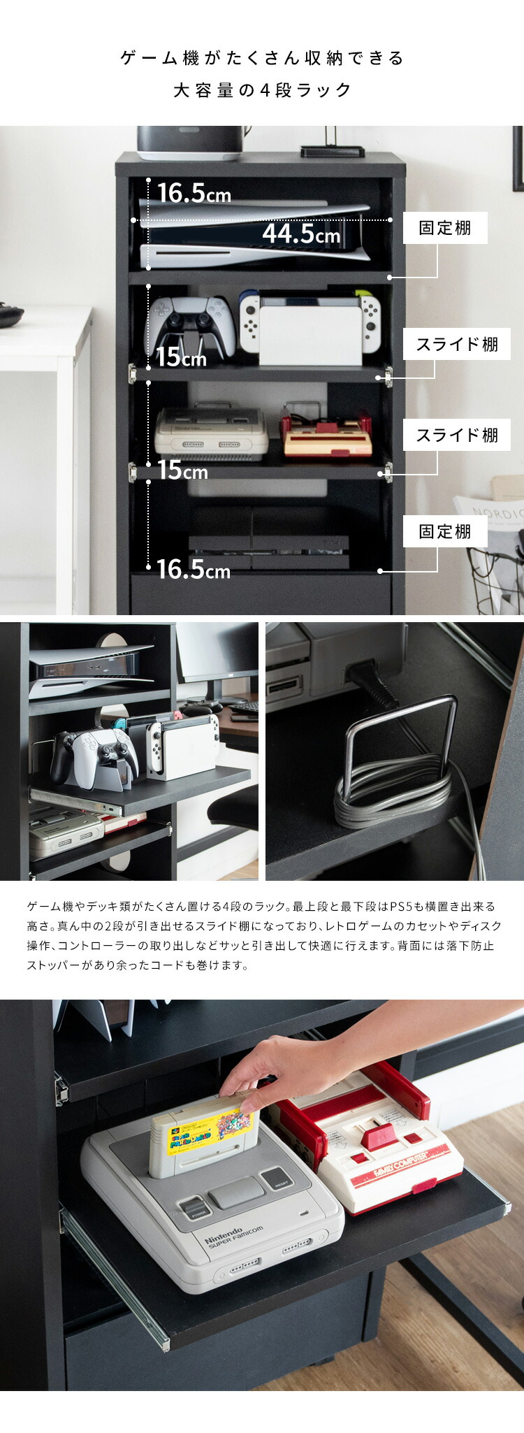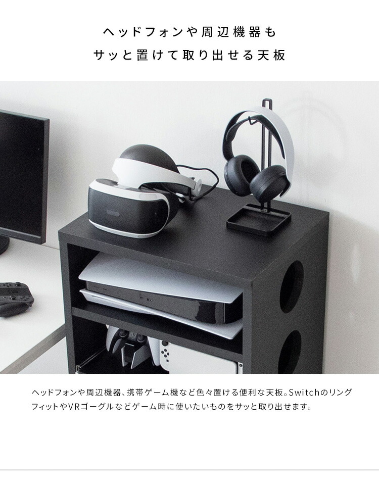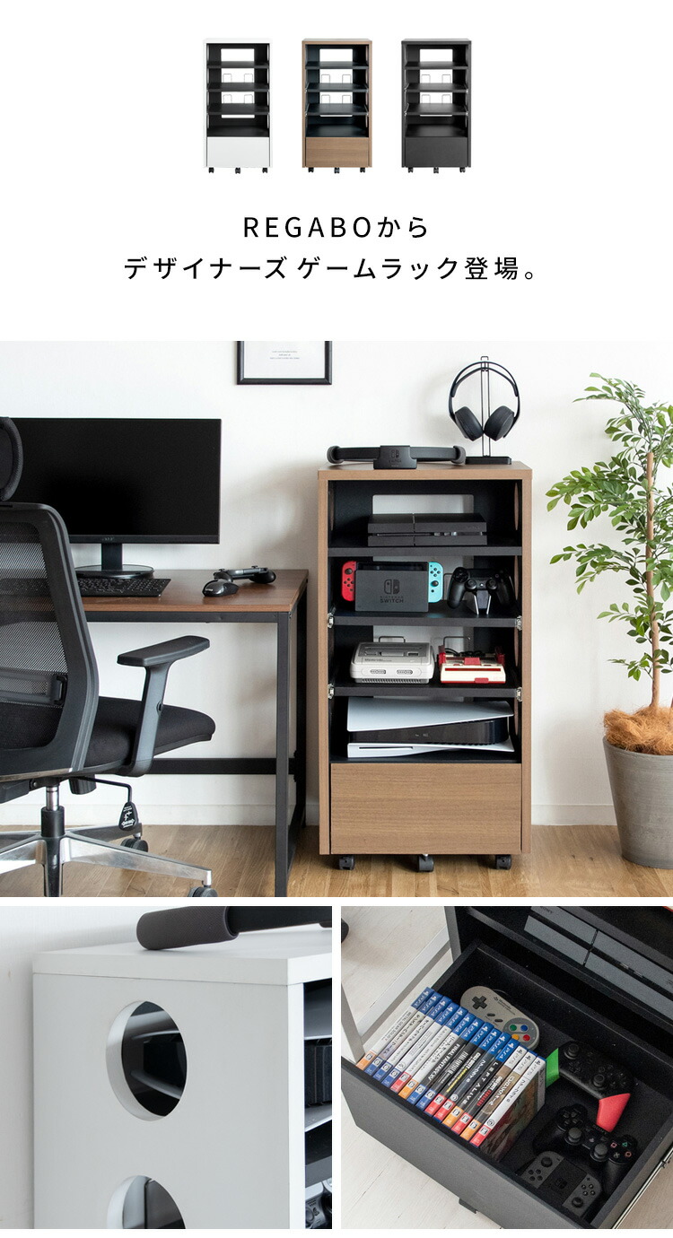 ゲーム機やコントローラー、ソフトや周辺機器をまとめて収納できる便利なデザイナーズゲームラック『REGABO(レガボ)』。 PS5など据置型ゲーム機が収納できる棚は真ん中2段がスライド引き出しになっておりレトロゲームのソフトのセットもラクラク。ヘッドフォンやSwitchなど携帯ゲーム機が置ける天板やゲームソフトやコントローラーが入る引き出し付きで収納力バツグン。キャスター付きで移動もラクラク。お部屋に馴染むスマートなデザインのラックでごちゃつきなゲーム機器をまとめて収納することで、おしゃれな空間を演出します。サイドと背面オープン仕様で放熱対策も万全。