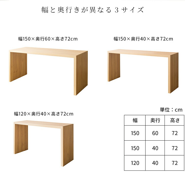 シンプルなデザインはデスクだけでなくテーブル、カウンターなどお家の色々な場所でマルチに活躍します。厚み4cmの頑丈な設計でパソコンやプリンターも置けるので、テレワークや在宅勤務の方にも安心してお使いいただけます。ナチュラルの優しい色合いがお部屋を明るく演出してくれます。幅と奥行きが異なる3サイズから、お部屋の広さや用途に合わせてお選びいただけます。