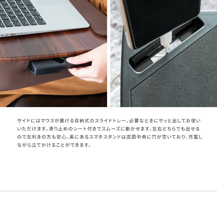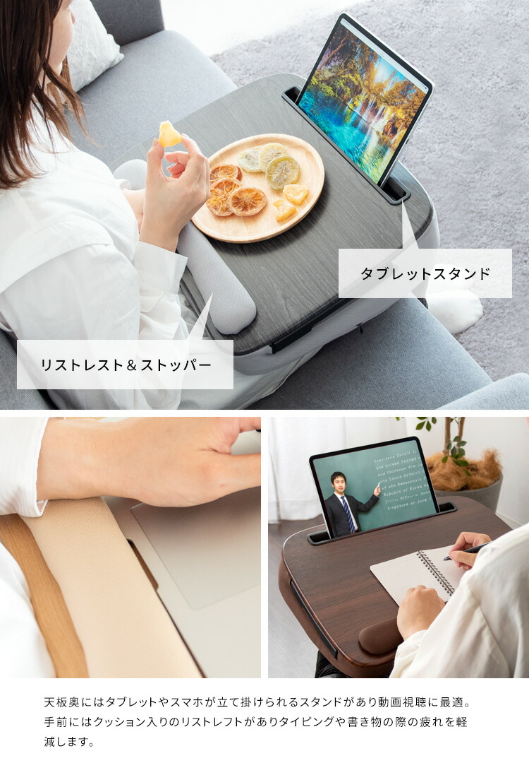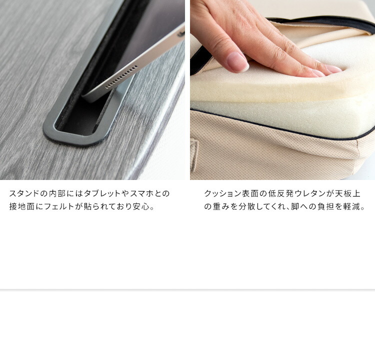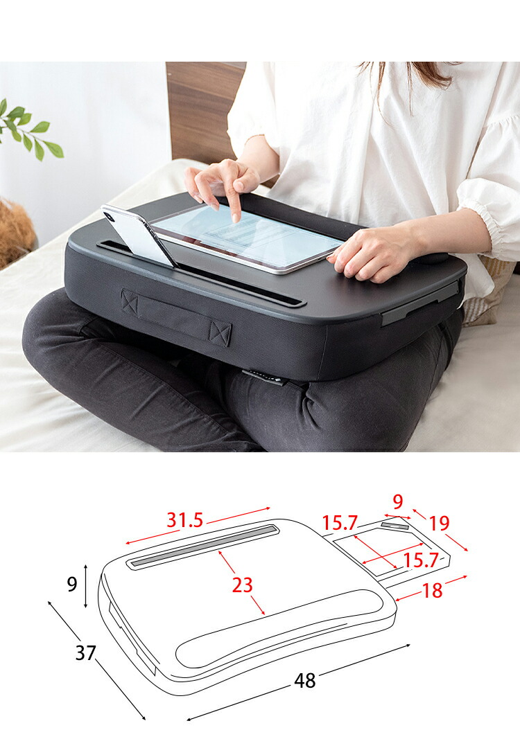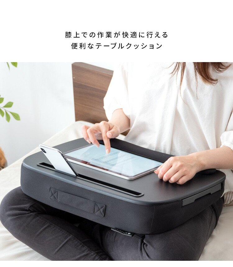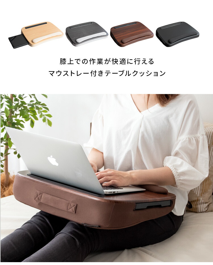 膝上でのちょっとした作業に便利なテーブルクッション。膝に乗せてノートパソコンやタブレットを乗せたり、本を読んだり、お食事を置いたり様々な用途にお使いいただけます。天板にはタブレットを立て掛けられるスタンドと、天板に置いたものの滑り止めにもなる手首の負担を軽減するリフトレストが付いております。クッションのサイドには左右どちらでも出せるスマホスタンド付きのマウストレーを内蔵。持ち手付きで持ち運びもラクラク。ソファやカーペット、ベッド、車内など色んな場所で活躍間違いなしです。カラーはお好みでお選びいただけるナチュラル、グレー、ブラウン、ブラックの4カラーをご用意しました。