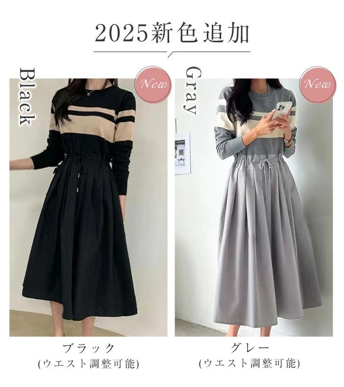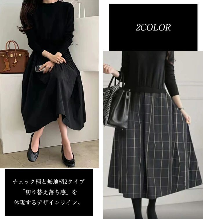 ワンピース きれいめ 秋冬 ロング 春 ワンピース 続々登場 無地-黒 チェック-グレー (new)ブラック+ベージュ (new)ベージュ (new)チェックー黒 (new)ブラック 【新色】ブラック(ウエスト調整可) 【新色】グレー(ウエスト調整可)